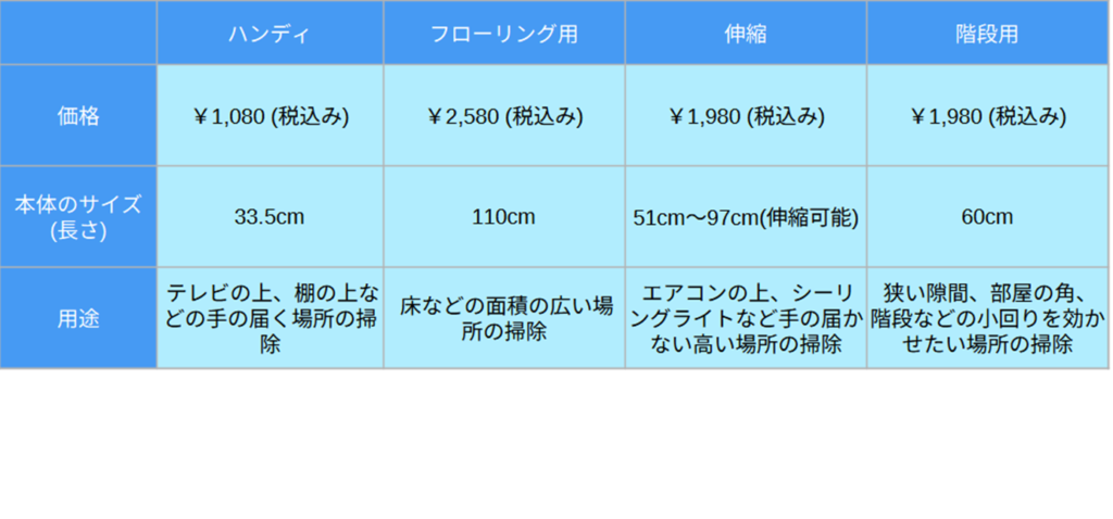 トレループシリーズには「ハンディ」「フローリング用」「伸縮」「階段用」の4つの種類があって、それぞれに得意なエリアがあります。